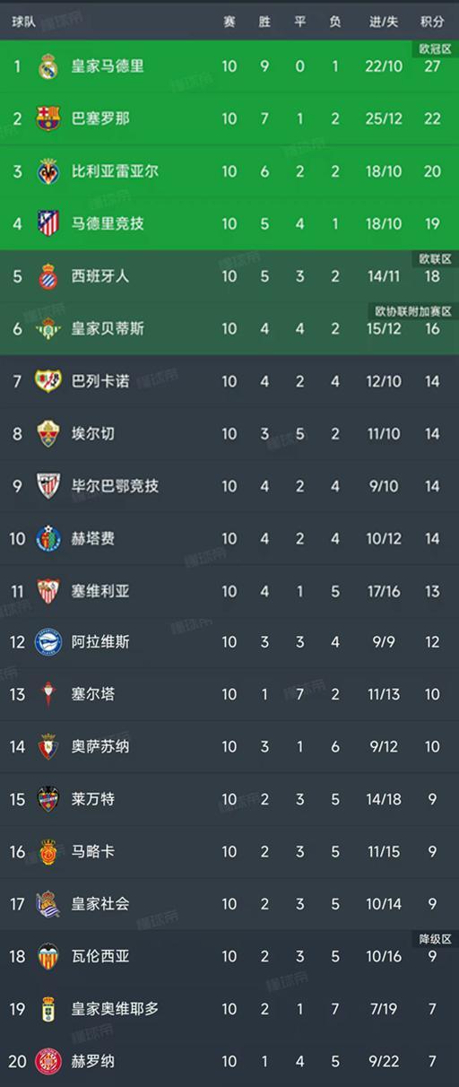 北京时间10月28日,马德里竞技2-0击败皇家贝蒂斯,结束西甲第十轮比赛。一起来看看最新的排名变化吧!最新西甲积分榜上,马德里竞技队总共获得了11次西甲冠军。他们被视为一支挑战皇马和巴萨格局的球队。本赛季他们虽然5-2击败皇马,但成绩却并不稳定。虽然到目前为止他们只输了一场比赛,但平局太多,目前积分上还没有进入前三。马德里竞技队在对阵皇家贝蒂斯队的比赛中取得了梦幻般的开局,西蒙尼在第3分钟的抽射高出球门。进球后,马德里竞技主攻反击。上半场结束前,巴埃纳左路破门,马竞2-0领先。末节末段,尽管皇家贝蒂斯发起进攻,但马德里竞技队防守依然坚挺,将比分2-0保持到终场。这是他们连续第二次西甲联赛的胜利,也是他们本赛季的第五场胜利。他们积19分暂时排名第四,仅落后巴塞罗那3分,落后领头羊皇家马德里8分。皇家贝蒂斯遭遇本赛季第二场失利,积16分跌至第六位。皇马保持优势。皇马和巴萨本赛季面临着强强对抗。皇马依靠贝林厄姆的传球和姆巴佩的进球,2-1击败巴塞罗那。费尔明为巴塞罗那的进球做出了贡献。亚马尔彻底失败了!上赛季,皇马在国家德比中四次输给巴塞罗那。今年,我屏息以待复仇。再加上赛前亚马尔对皇马的嘲讽,皇马球员求胜积极性高,最终在主场取得了一场宝贵的胜利。目前皇马积27分高居积分榜榜首,领先巴萨5分。在经典赛中,亚马尔以失误获胜,但卡瓦哈尔受伤,卢宁在比赛中红热。赛后冲突。这些细节都值得皇马关注。巴塞罗那已经落后皇马5分,亚马尔的心理健康状况为负面。伤口里隐藏着危险。巴萨在接下来的比赛中不能犯太多的错误。比利亚雷亚尔成为第三支得分超过20分的球队,暂时排名第三。目前降级区倒数三支球队分别是积9分的瓦伦西亚、积7分的皇家奥维耶多和积7分的赫罗纳!