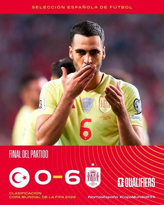 在9月8日的2:45,北京时代在2026年世界杯预选赛的欧洲第一阶段的第六轮中取得了6-0的胜利,即2026年西班牙球队,即世界第二名的西班牙球队,这是第27次土耳其球队的挑战。阿森纳美利奴(Merino)中场球员赢得了帽子戏法,公牛将军的出色合作令人难以置信。下一个世界杯注定要取得巨大的成功!土耳其队在世界上仍然相当不错。今年,他们在五场比赛中仅输掉了1-1对墨西哥,而Sialjanoglu,Gere和Ildis开始。相比之下,作为2024年欧洲杯的冠军,西班牙队仍然很强大。雅马尔(Yamal),佩德里(Pedri),梅里诺(Merino)和海森(Haizen)已成为新一代公牛战斗人员的重要球员,最终使对手失败了6个进球!在比赛的六分钟内,西班牙帮助进行了进攻,尼科维利亚姆(Nicowilliams)传球,佩德里(PedriD西班牙球队的开局不错,0-1!在第22分钟,西班牙队发起了一场出色的土地合作攻击,将其直接传达给对手的目标。 Oyasabal帮助Merino,0-2!在不活动时间的上半场的第一分钟,西班牙的出色进攻合作仍然存在。 Oyasabal从左侧传递了球,Merino继续前进,两次得分,0-3!在此的上半场,土耳其队希望通过冲突来主动行动,但西班牙队默认合作迅速进攻,打破了国防线的路线!双方在下半场再次战斗。西班牙在第53分钟为自己辩护,山莫基通过了球,费兰·托雷斯继续以0-4获得比赛!很快,在第57分钟,另一个来自西班牙的反击。雅马尔(Yamal)在罚球区域以外的球传球,美利奴(Merino)调节器得分,得分,得分为0-5!在第62分钟,西班牙仍然在反击中得分。奥亚萨巴尔(Oyasabal)取得了出色的传球,佩德里(Pedri)得分为0-6!在比赛结束时,西班牙以6-0击败了土耳其。 E组在第二轮得分6分,打进9个进球,承认0个进球,并短暂加入了该小组。它被分类为第一。目前,他为来自阿森纳美利奴(Arsenal Merino)的29岁西班牙中场球员效力,他成功地抢走了比赛球。他成为西班牙球队的第二位中场球员,在过去的15年中取得了帽子戏法!西班牙在球队历史上加入了第二大得分差,在2017年9月以8-0击败Liechtenstein之后,西班牙担任首席教练的位置,平均2.69个进球并在25场比赛中训练了33场比赛。从战术角度来看,西班牙团队继续执行技术风格。今天,BU Legionll战斗人员更加关注中场领域的竞争以及高效和快速的反击。西班牙球队在此拥有50%比赛,但投篮命中率是21-11,投篮命中率是12-2,极好的可能性是10-0,钢铁为26-13,土耳其队在世界上保持27位,只用尽了防守!当球迅速传球时,西班牙队抓住了他们的犯罪对手,在一场比赛中最多赢得了六杆。球。佩德里(Pedri),雅马尔(Yamal),美利奴(Merino),奥亚萨瓦(Oyasavar)和其他人具有隐性的理解。由于其在乡村中心和前场的进攻性合作,土耳其队的防守线看起来像纸。在这一点上,西班牙球队在2026年世界杯预选赛中迈出了更加坚实的一步。凭借其强大的进攻能力和优秀球队的合作,世界上其他足球敌人不会低估他们!